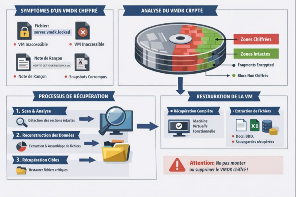La récupération dépend fortement de l’ampleur du chiffrement et des sauvegardes disponibles :- Si le ransomware a seulement chiffré le VMDK